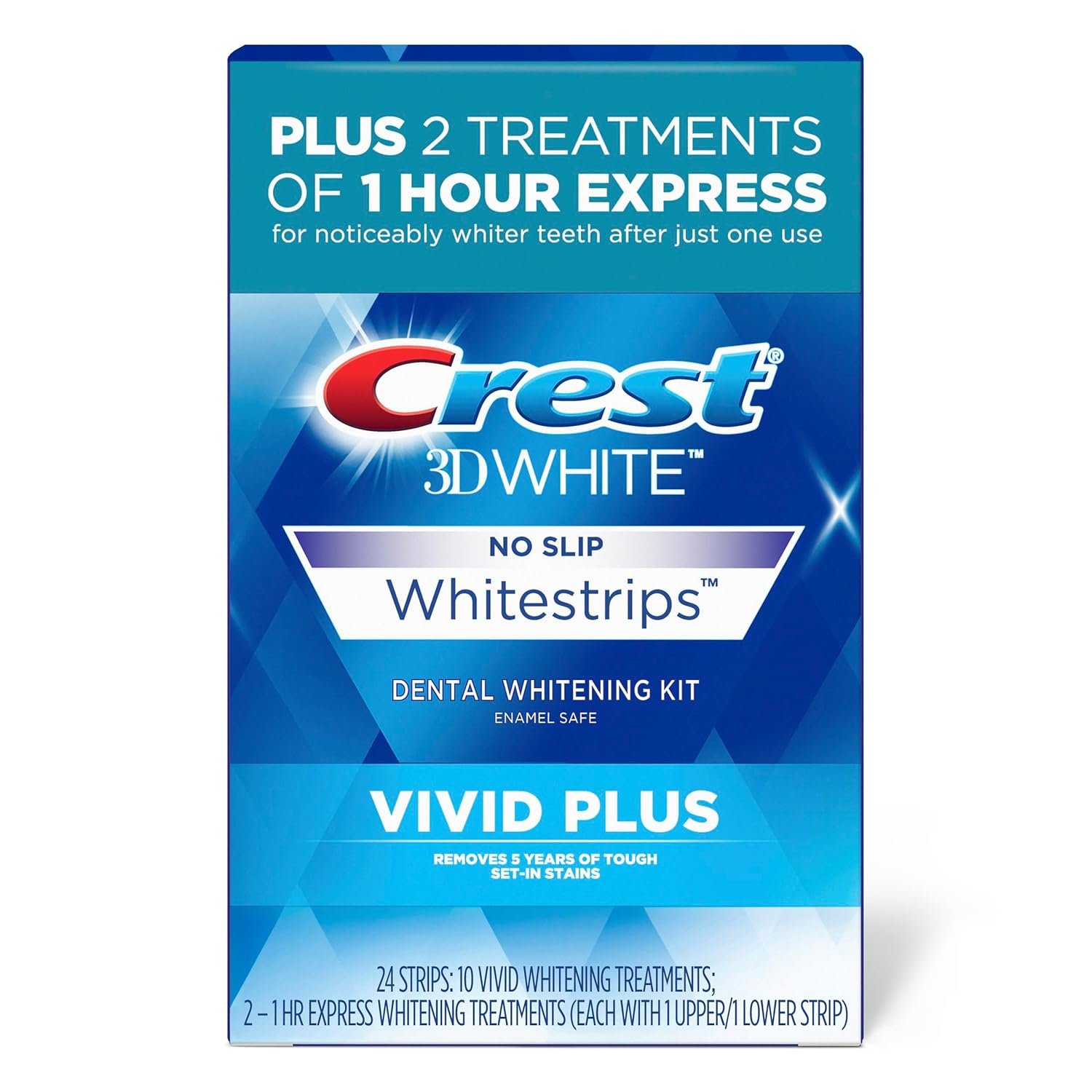 Want a whiter smile at home? Choose Crest 3DWhitestrips from the #1 dentist-recommended at-home teeth whitening brand and get 100% noticeably whiter teeth, guaranteed. Achieve a brighter, whiter smile in just 12 days with Crest 3DWhitestrips Vivid Plus. This offering features 30-minute teeth whitening treatment makes it easy to whiten teeth without leaving the house and also comes with 2 bonus 1 Hour Express treatments for fast results. Plus, the Advanced Seal Technology�s comfortable, no-slip grip stays put, so you can talk and drink water and chat with friends even while whitening your teeth. Simply apply Crest 3DWhitestrips Vivid Plus for 30 minutes a day for 8 levels whiter teeth. This pack includes 24 teeth whitening strips, 12 for your top teeth and 12 for your bottom teeth, to be used over the course of 12 days.