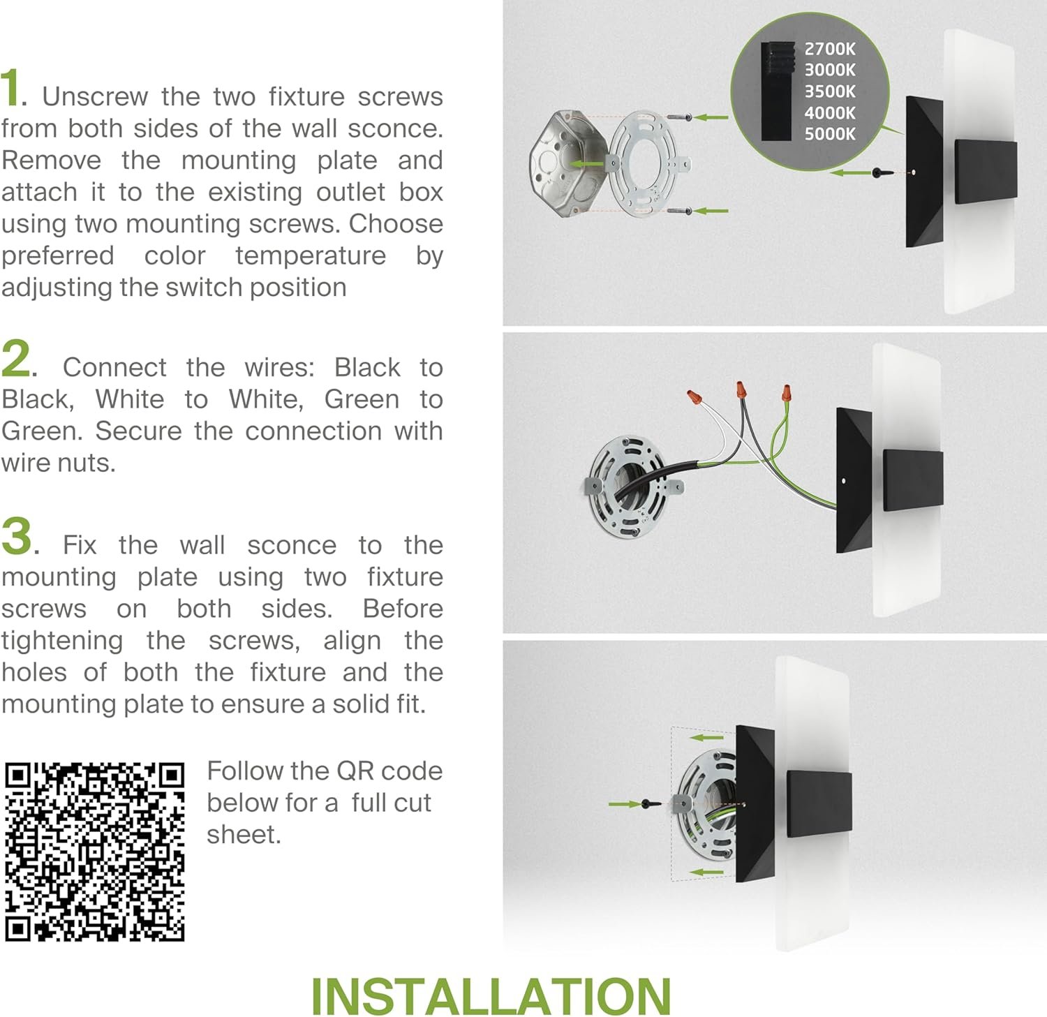 COLOR SELECTABLE: Choose among 2700K Soft White, 3000K Warm White, 3500K Neutral White, 4000K Cool White, or 5000K Daylight color temperatures with a simple switch. The interior wall light fixture is designed to operate on 120V circuits.