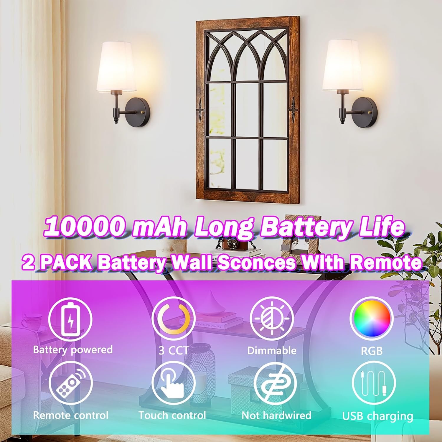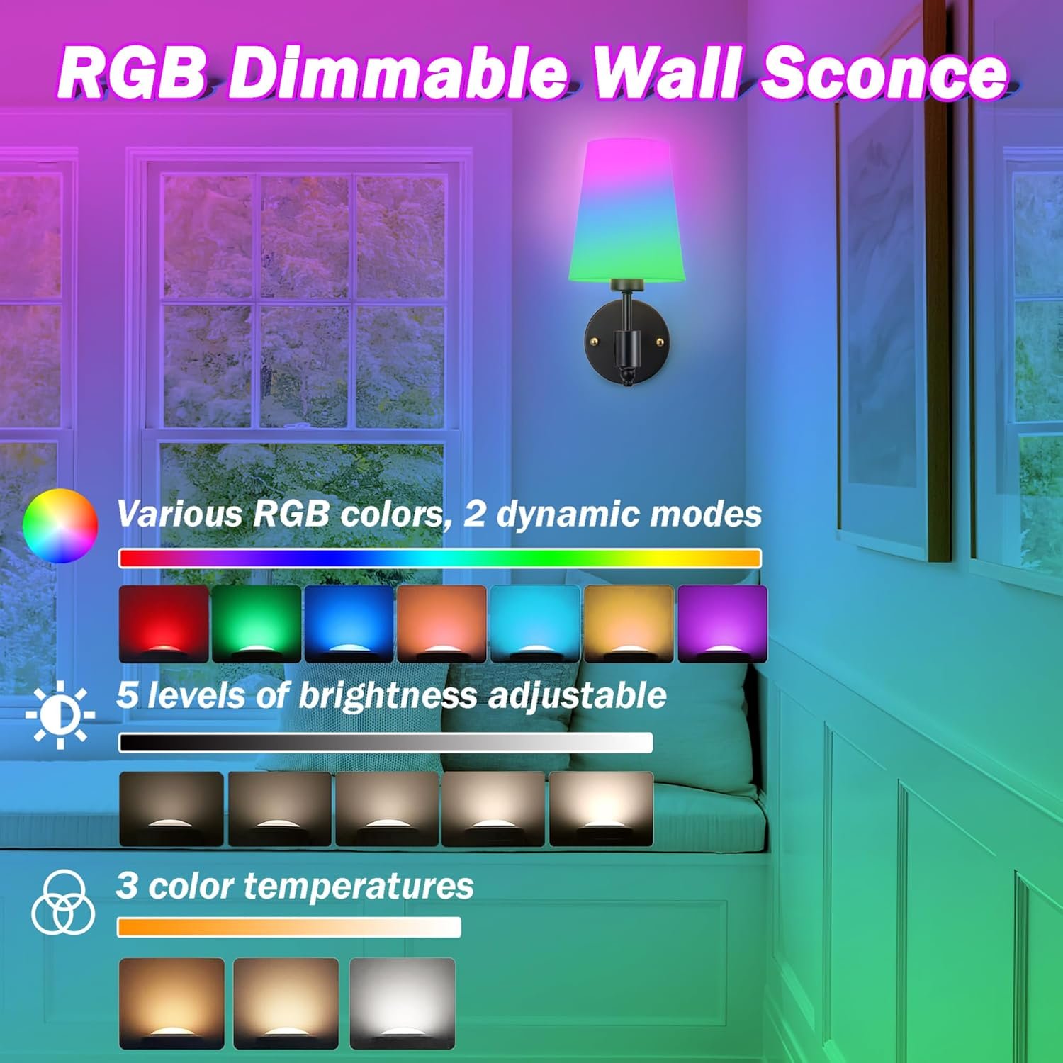 RGB led color changing light bulb included: The battery wall sconce provides warm light/natural light/white light, as well as a variety of RGB colors. The two light modes of flash and smooth allow you to create the right atmosphere at any time, giving you a better visual experience.
