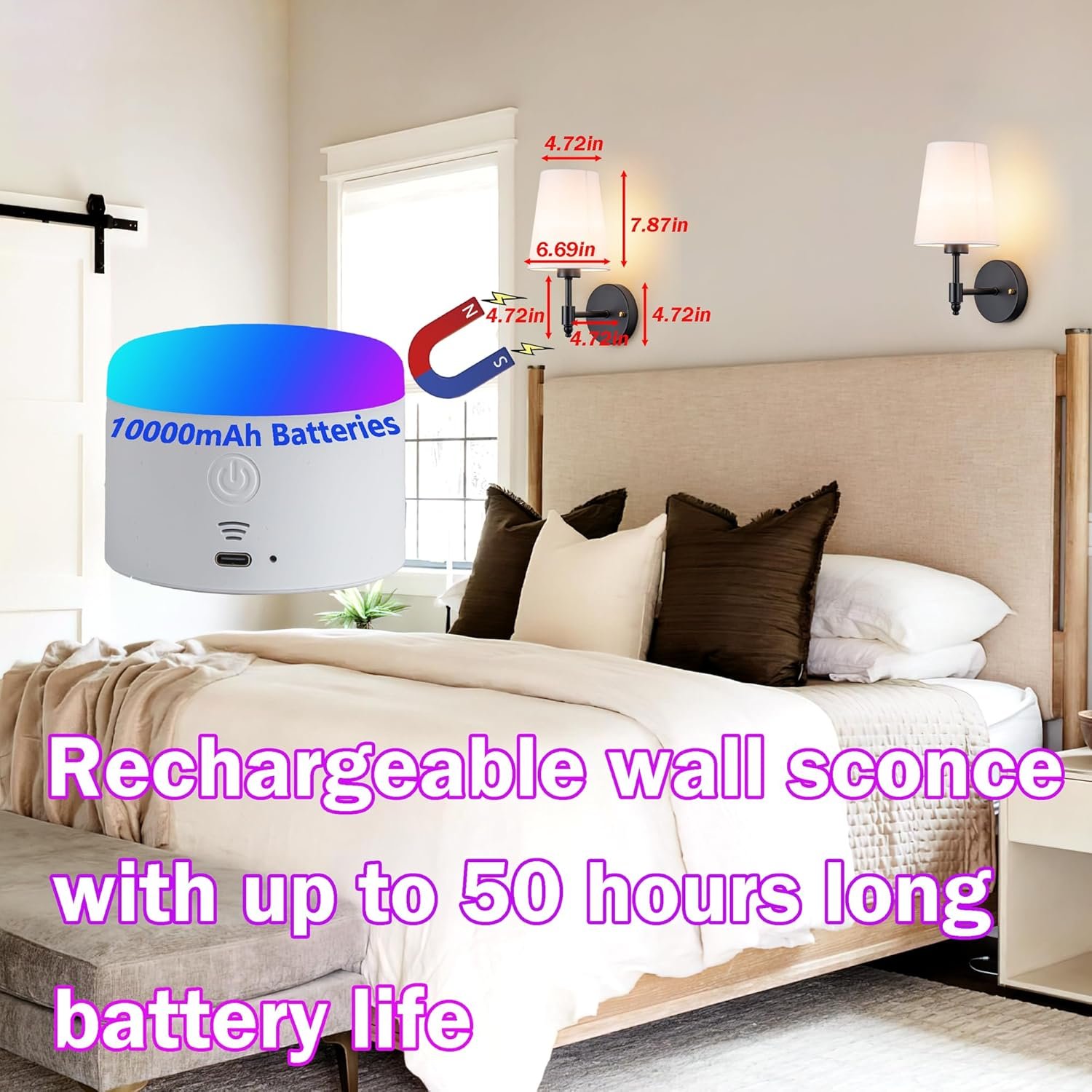 Battery Operated Wall Lights Adjustable Brightness: Dimmable wall lights with 5 levels of brightness. Lasts 15-50 hours on a single charge, suitable for various spaces like bathrooms, bedrooms, hallways, and living areas. Valuable during power outages.