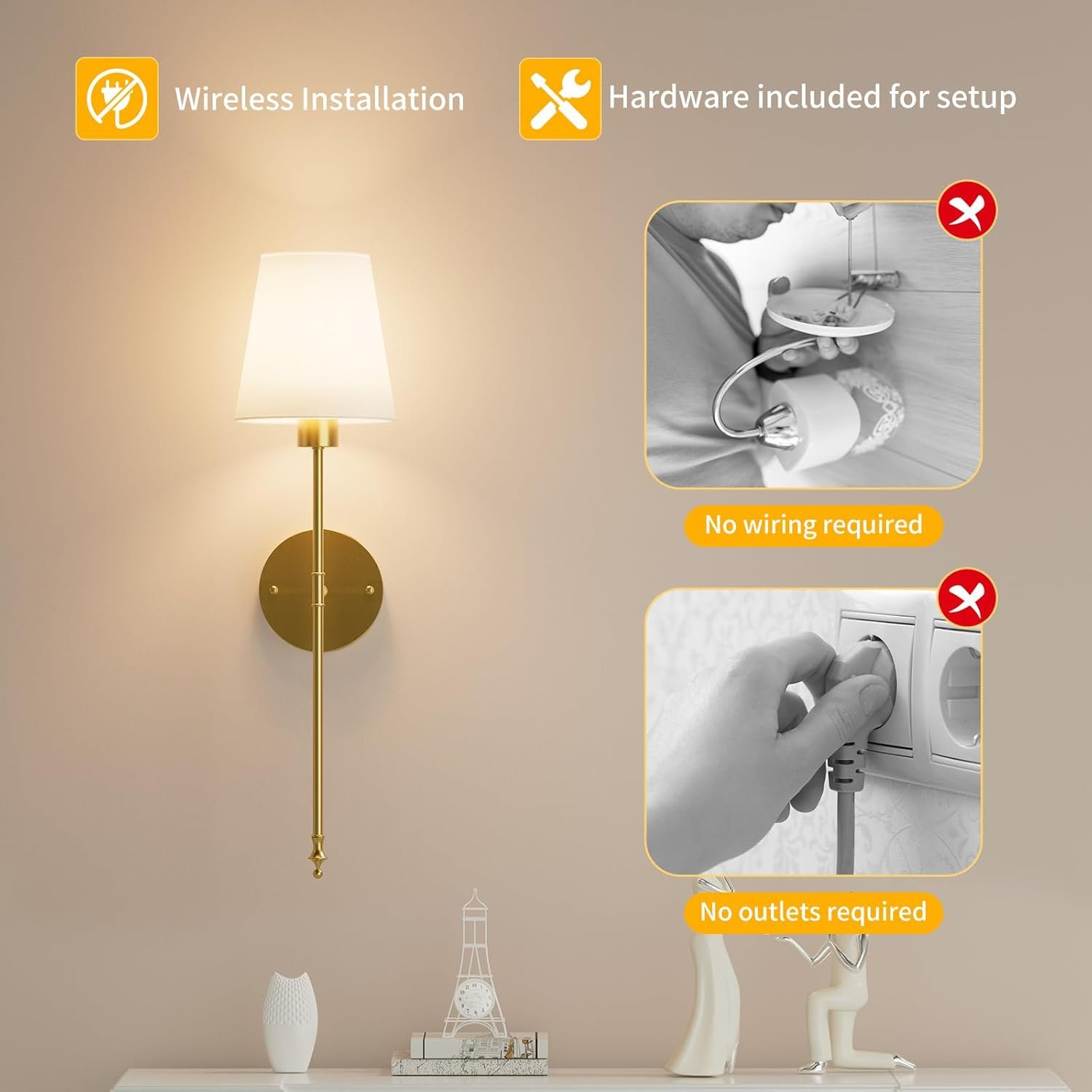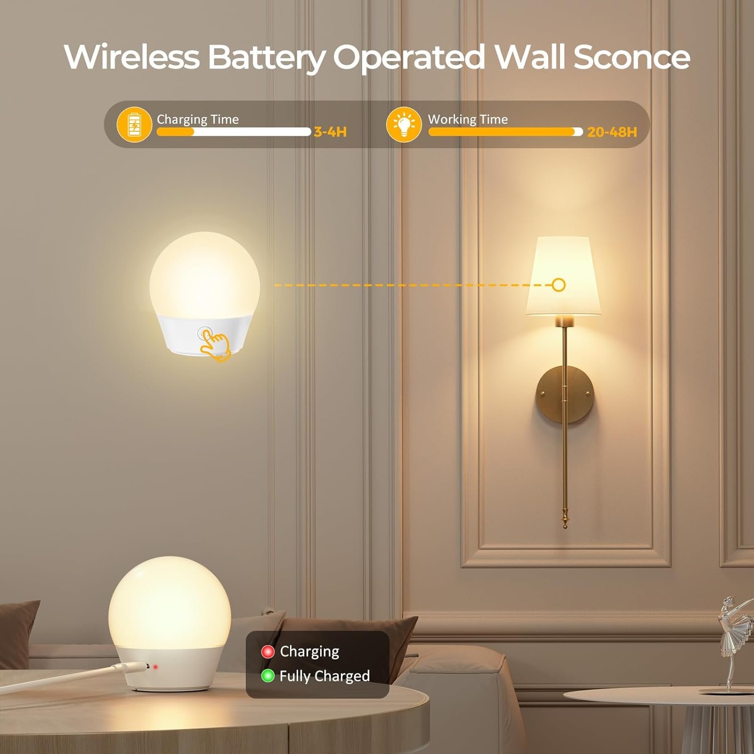 【 Battery Operated Wall Sconces Set of Two 】- Each sconce features a high-quality matte metal frame with a white fabric shade, offering a sleek and modern look. These battery powered wall lights are powered by detachable, rechargeable bulbs with USB charging ports. You can use the included Type-C USB cable to charge the bulb, which takes 3-4 hours to fully charge and runs for 20-48 hours