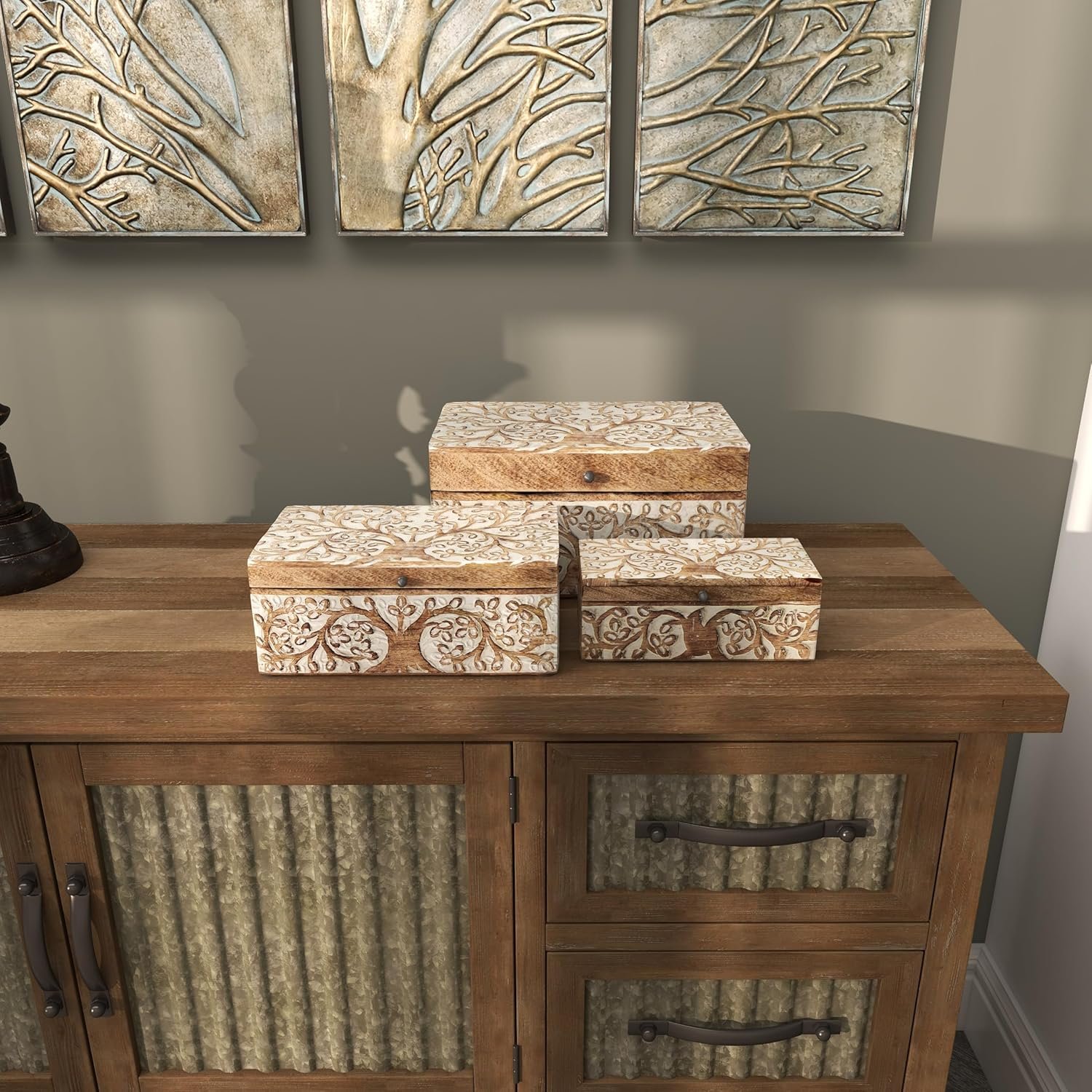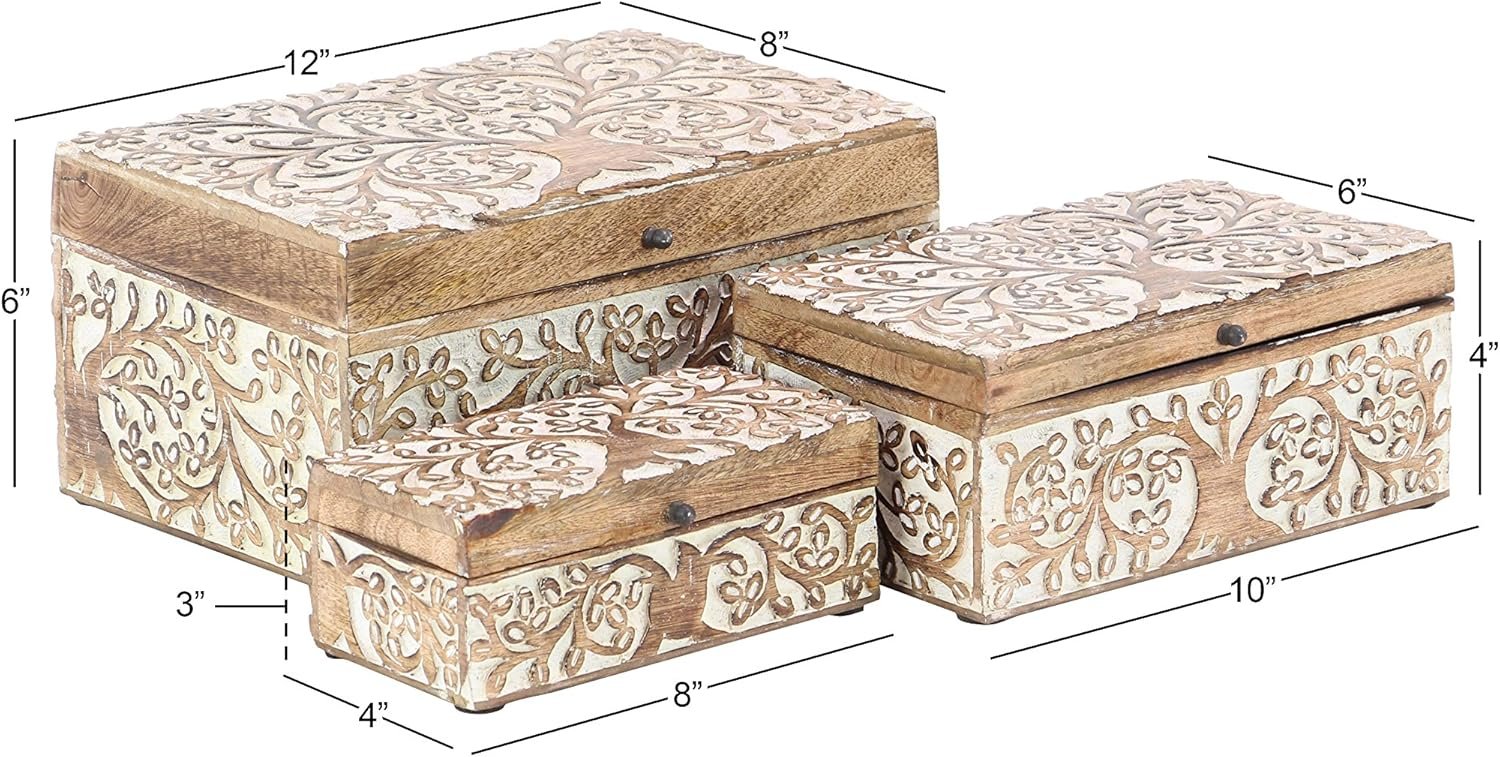 8 reviews for Deco 79 Mango Wood Floral Decorative Box Decorative Keepsake Boxes with Hinged Lid, Set of 3 Storage Boxes 8″, 10″, 12″W, Brown