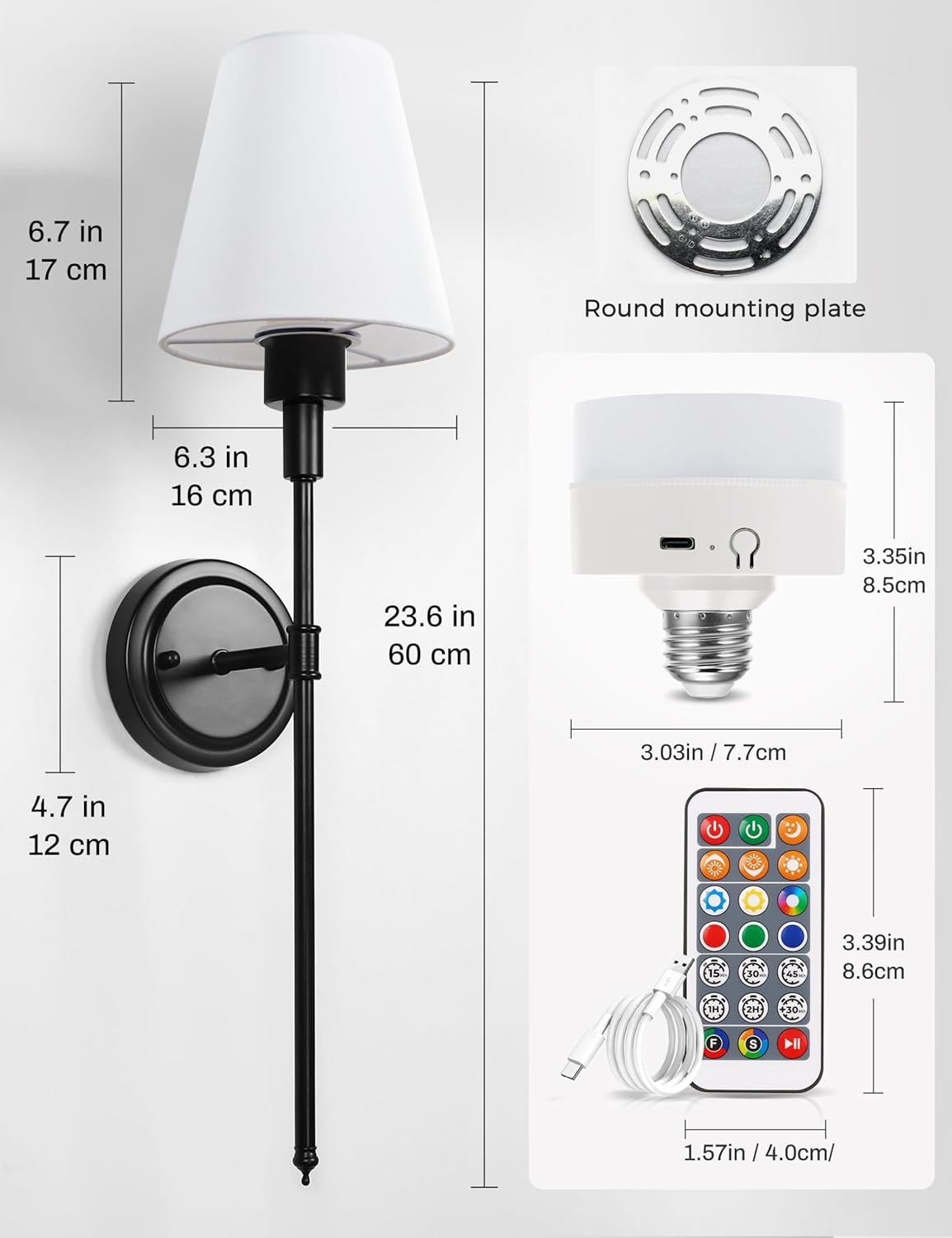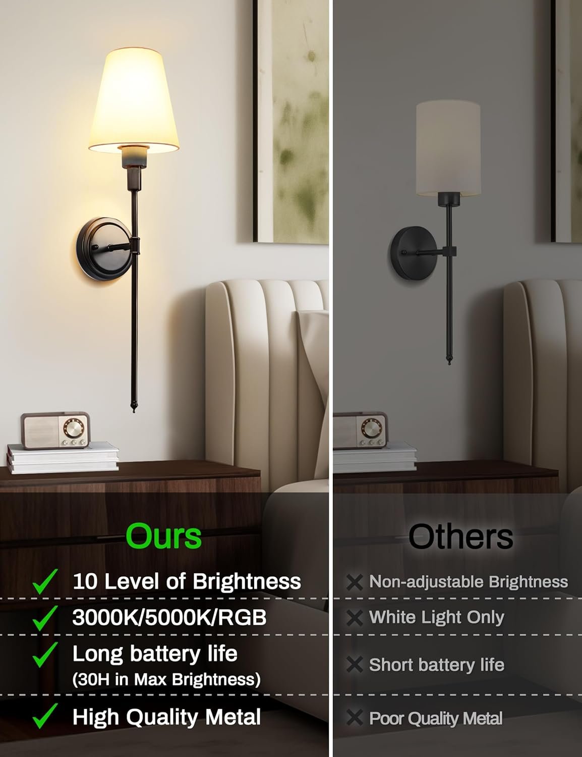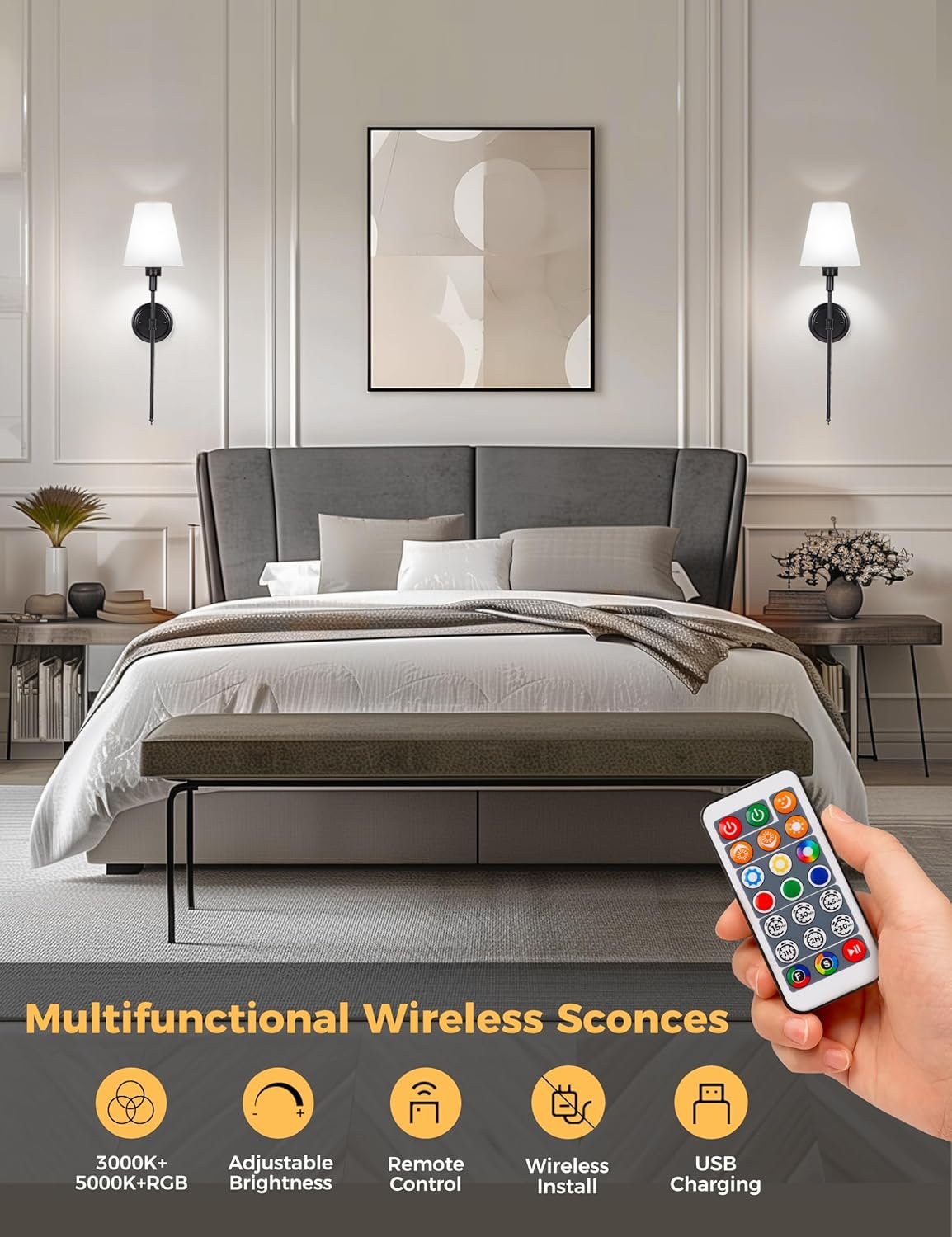 【Upgrade Wireless Remote Control- All Color & Adjustable】- The battery-operated wall sconce comes with a remote control, allowing for 10-level dimmable brightness (10%-100%) and adjustable color temperature (3000K/5000K/RGB). It also offers 6 timer options.