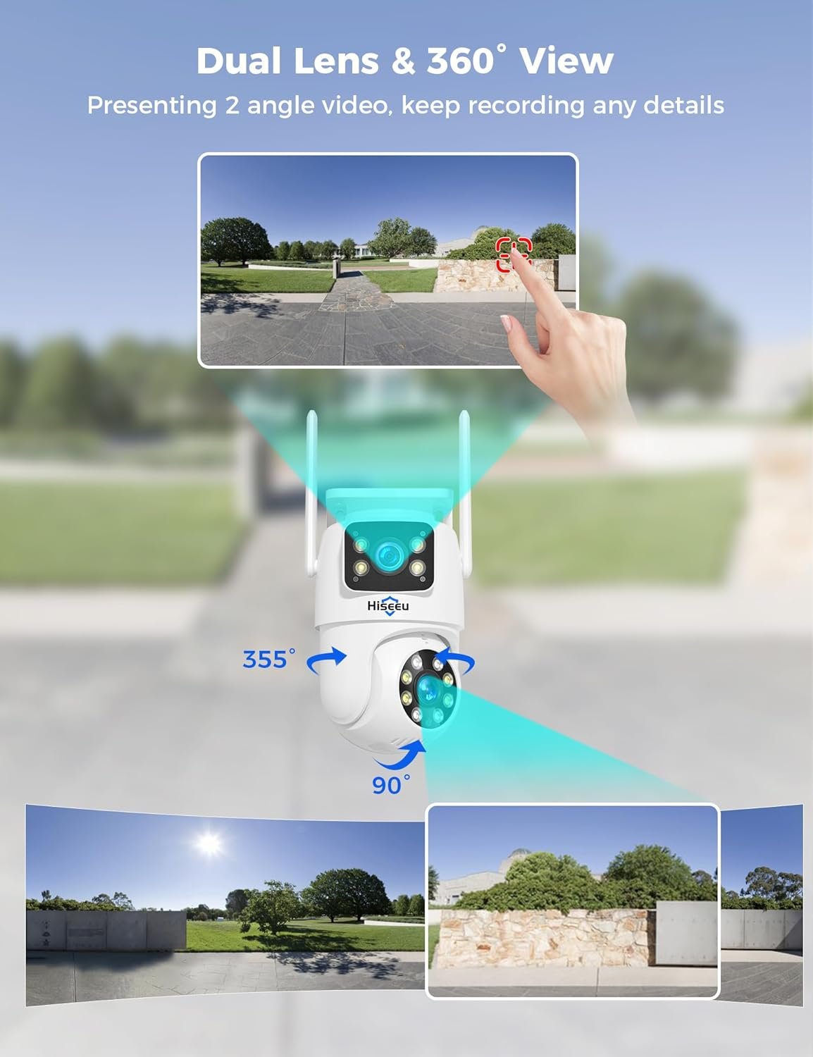 App Push & Motion Tracking: The dual lens outdoor wireless camera built-in PIR motion sensor that is highly sensitive to capture motion accurately even in the dark, no more false alarms push on the Eseecloud app. The PTZ camera will automatically track and follow that individual, while the top fixed camera remains same point.