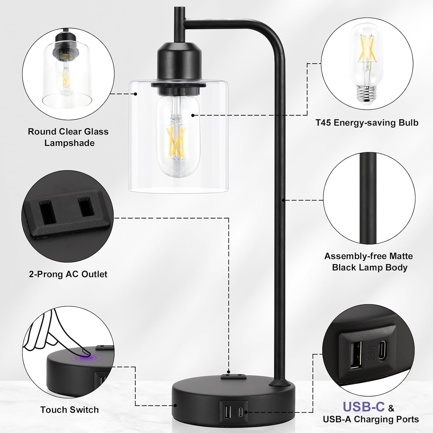10 reviews for Industrial Touch Table Lamps for Bedrooms Set of 2 – 3-Way Dimmable Nightstand Lamps with USB C+A Ports and Outlet, Black Bedside Lamps with Glass Shade for Living Room, Desk Lamps for Home Office