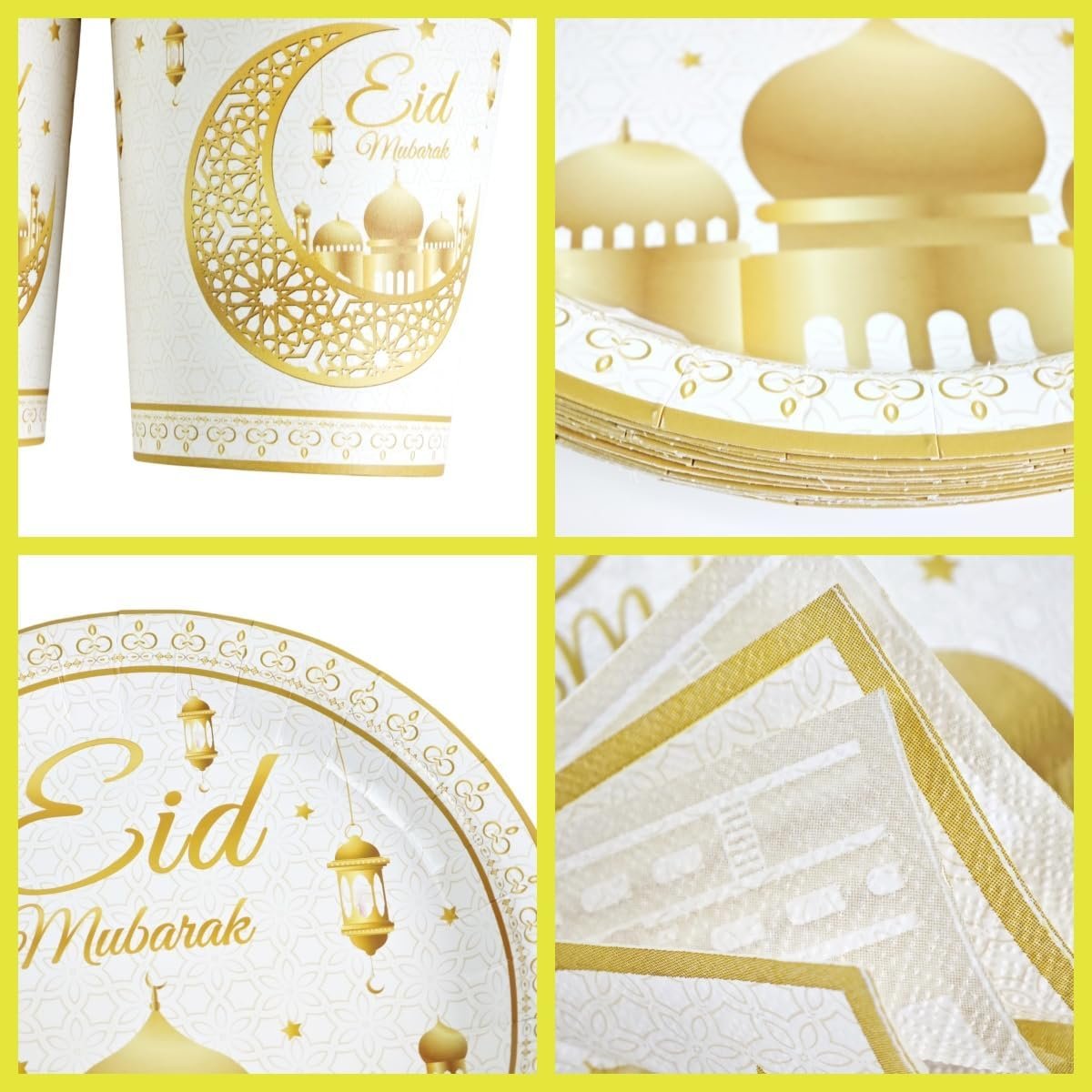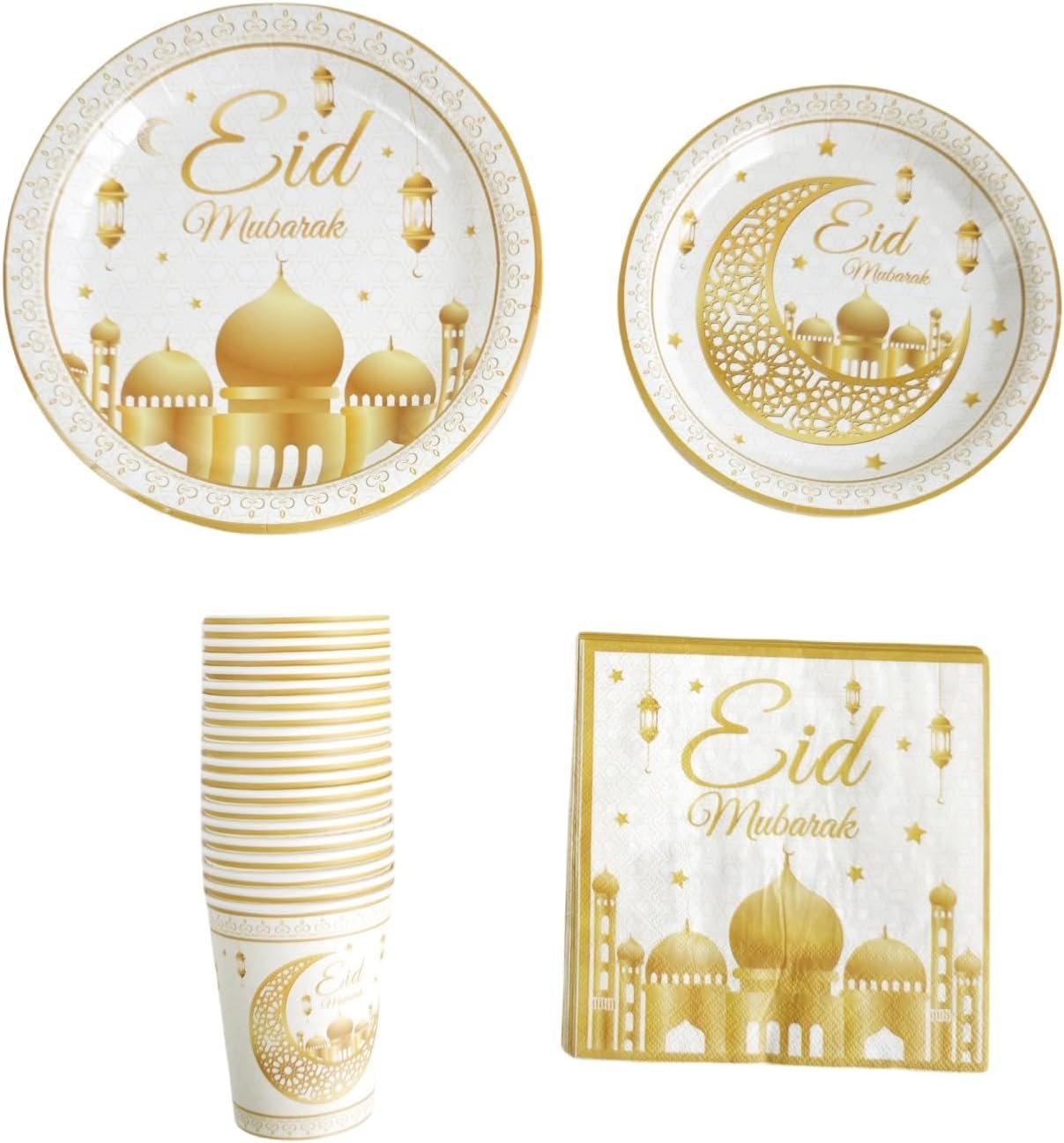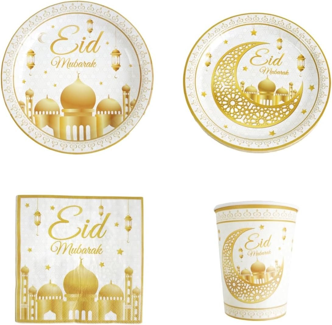 This premium set includes dinner plates, dessert plates, cups, napkins, and cutlery, all adorned with “Eid Mubarak” text, crescent moons, and stars in a beautiful gold and white color scheme.