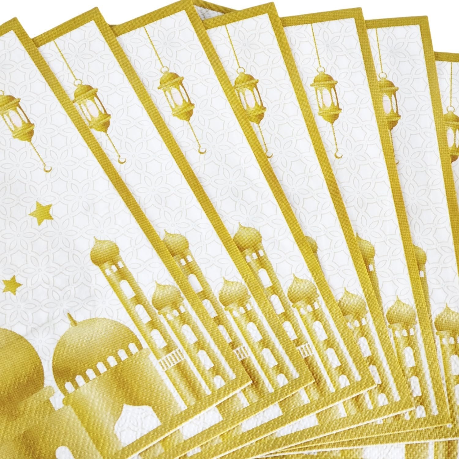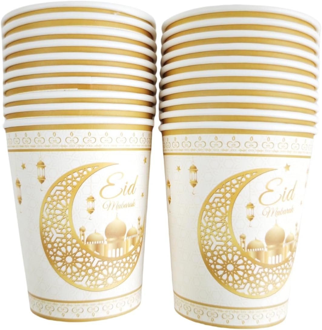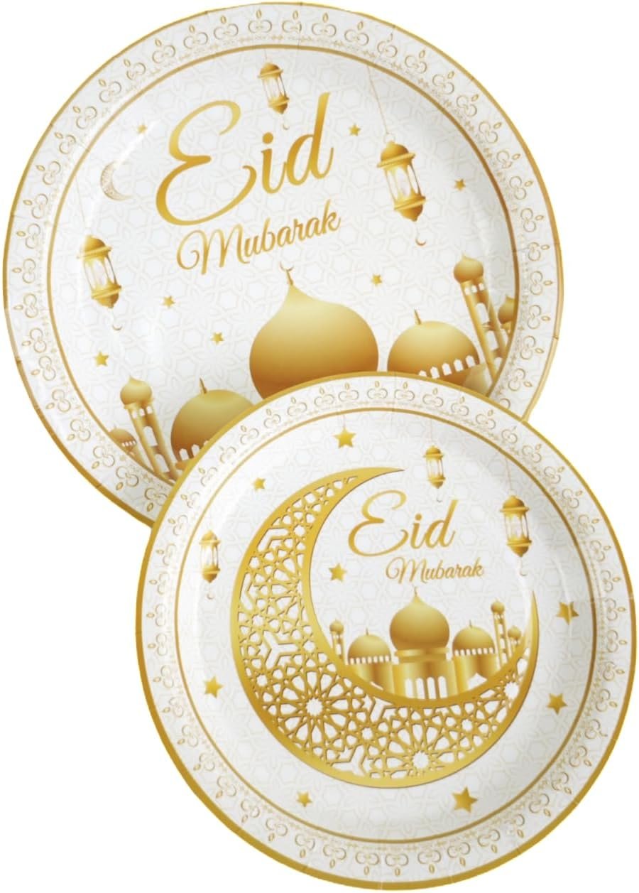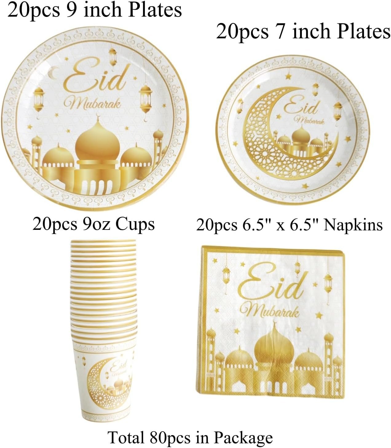 Complete Tableware Set – Includes 20pcs 9 inch dinner plates, 20pcs 7 inch dessert plates,20pcs 9 oz cups, 20pcs 6.5 x 6.5 inches napkins, total 80pcs – serve for 20 guests – everything you need for a festive Eid celebration.