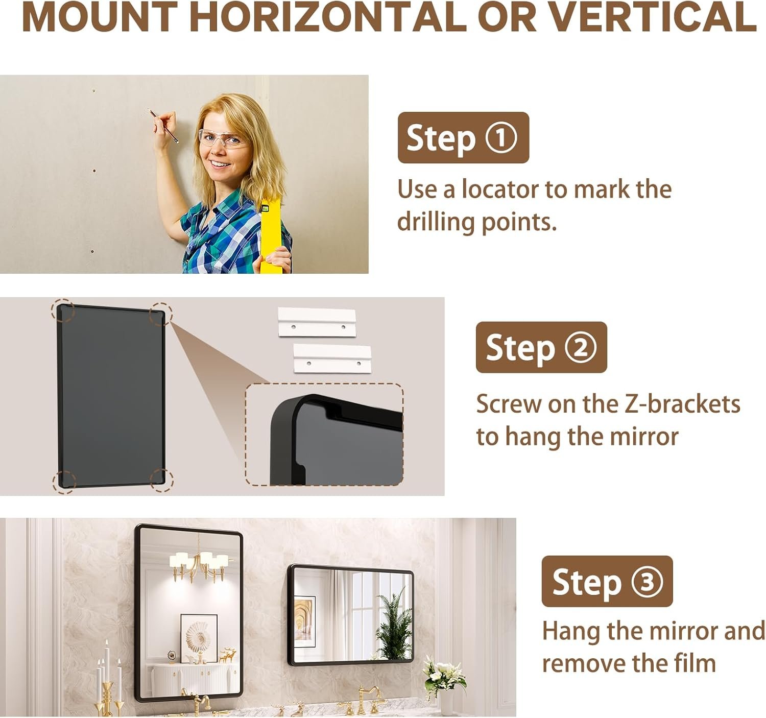 【Easy Sturdy Installation】The bathroom mirror with hanging design on the frame back to hang horizontally or vertically. Super easy to install with Z-bar sturdy wall bracket, ensures the mirror rests more securely against the wall. (Hardware included);