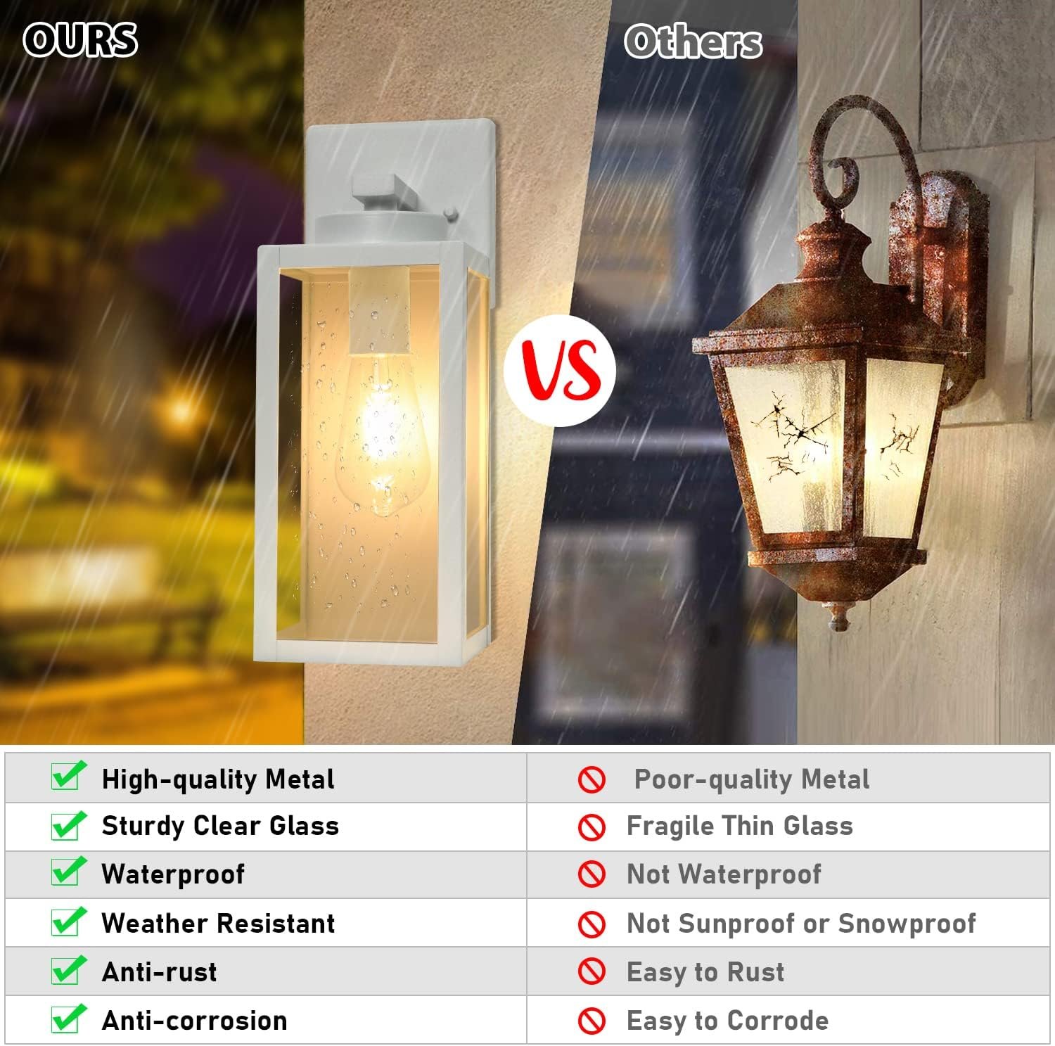 With the heavy-duty metal frame and high-strength glass panels, these exterior wall lamps work well even on extreme weather such as rainstorm, snowstorm, hurricane etc.