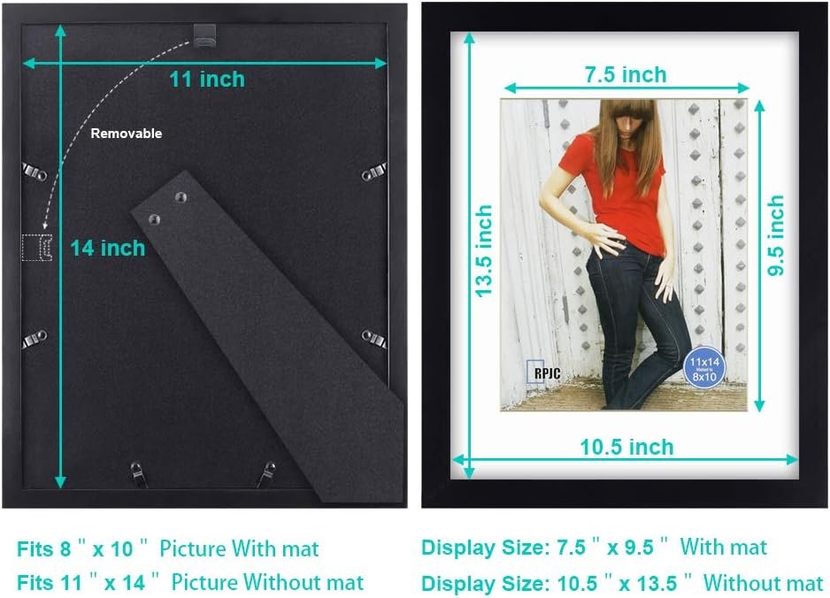 8 reviews for RPJC 11×14 inch Picture Frame Made of Solid Wood and High Definition Glass Display Pictures 8×10 with Mat or 11×14 Without Mat for Table Top Display and Wall Mounting Photo Frame with Stand Black