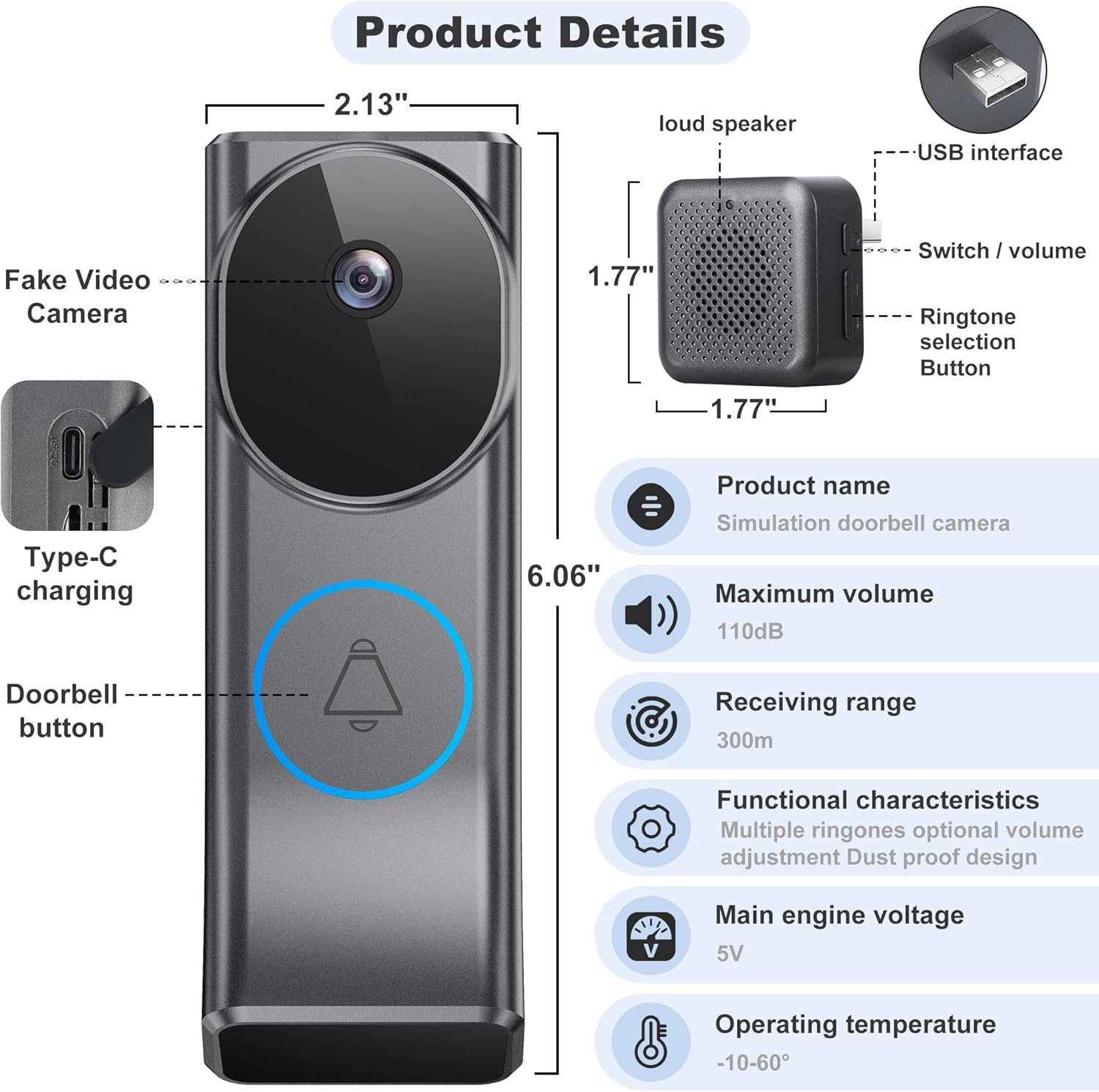 Wireless Fake Camera Doorbell – Stylish Design, Easy Installation, 55 Chord Tones with 5 Volume Levels (including Mute), Long Reception Range