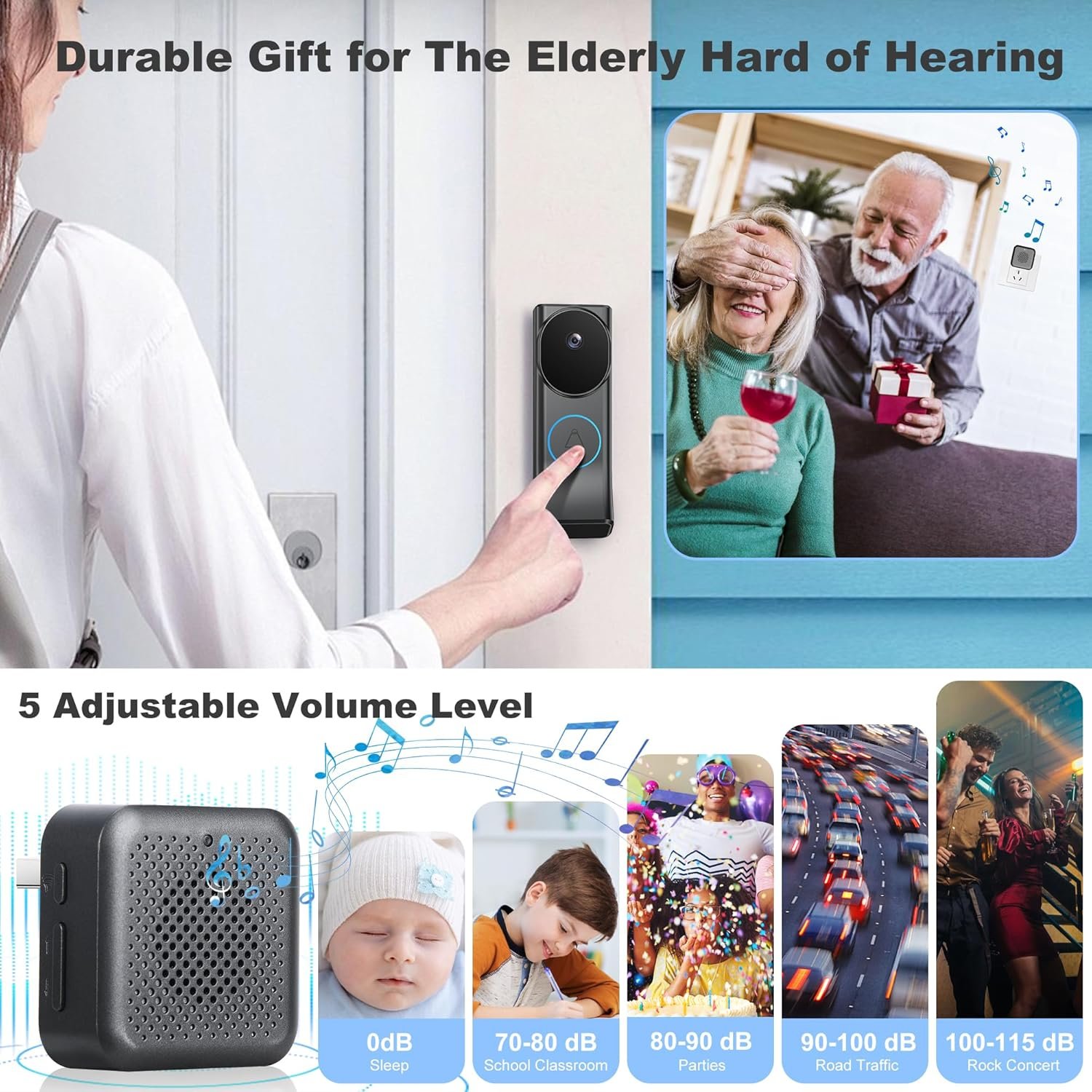 [55 Chimes & Adjustable Volume] Doorbell Camera Choose from 55 chimes (including festive ringtones) with 5 adjustable volume levels (0-110dB) and LED flashing alerts. Ideal for elderly, hearing-impaired, and pregnant users.