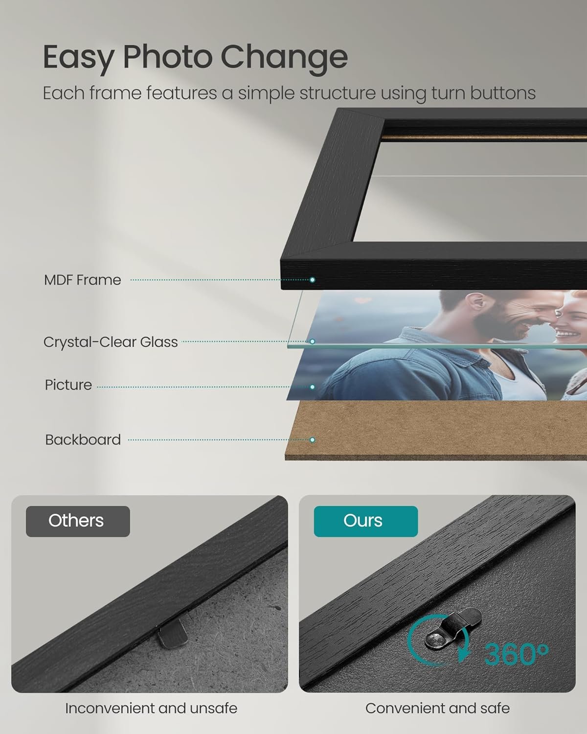 [Change Pictures with Ease] With durable turn buttons on the back of each picture frame, you’ll be able to easily change your pictures every time you want to revisit your favorite family memories.