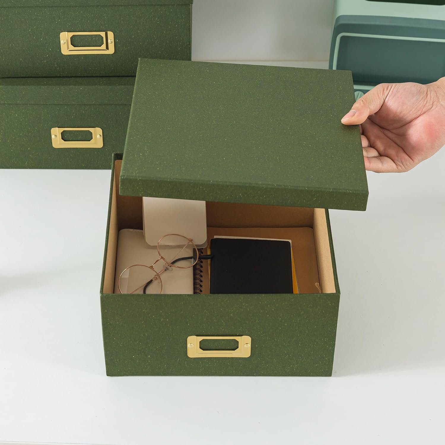 CONQUER THE CHAOS: Unravel the tangles of everyday life with these robust green kraft storage boxes. Ideal for stashing a wide array of items, from office essentials and hobby materials to personal mementos and tech gear. These green storage boxes with lids are the perfect size for shelving systems, adeptly accommodating your crucial paperwork, assorted knick-knacks, and stationery supplies.