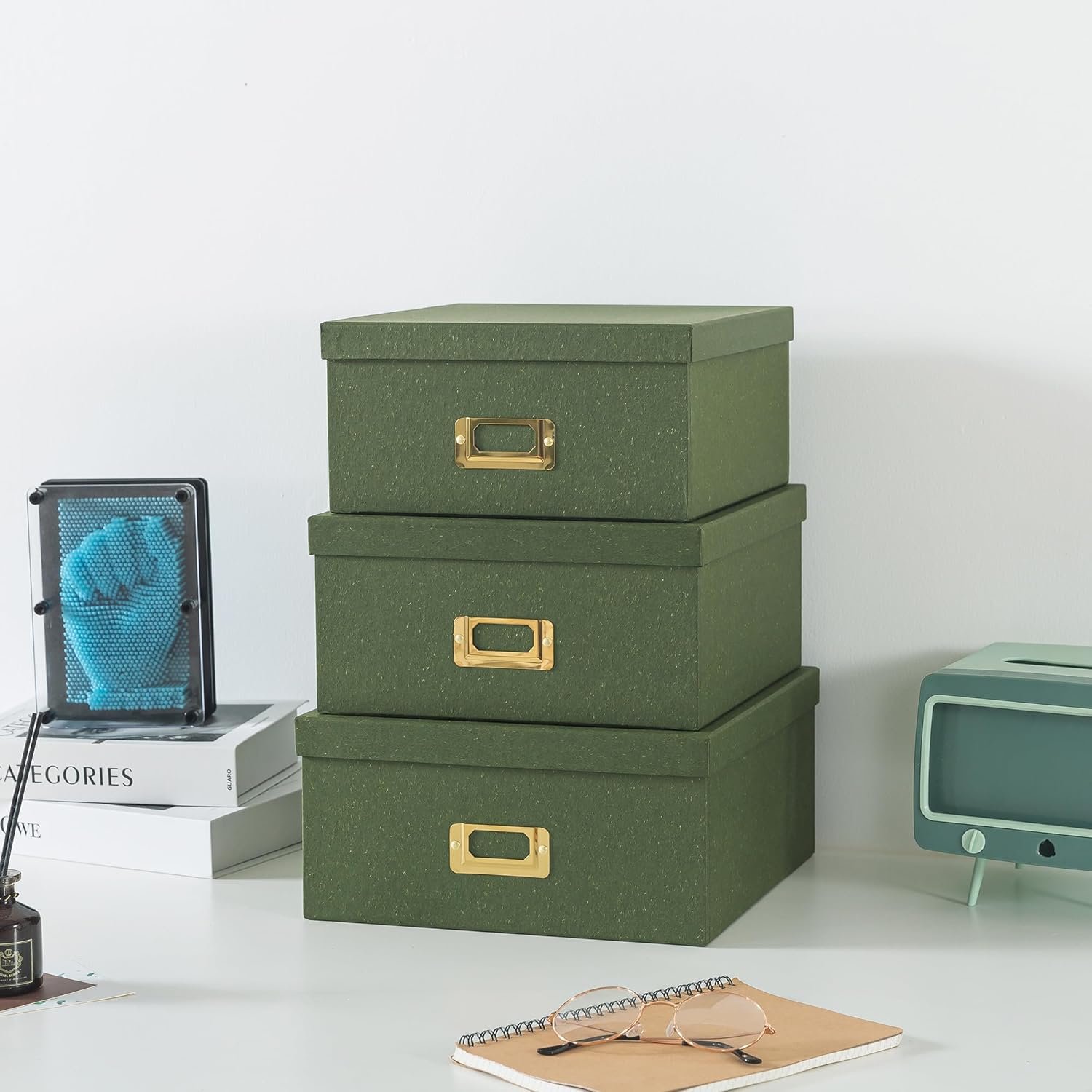 The subtle, earthy green hue of these boxes is carefully chosen to complement any interior design, from the modern minimalist office to the cozy corners of a country-style home. Their unassuming yet chic appearance allows them to sit neatly on shelves or desks, holding your items securely while enhancing the overall aesthetic of the room. The robust cardboard construction ensures durability, while the tactile finish of the textured paper invites the touch, adding an element of sensory pleasure to your organizational efforts.
