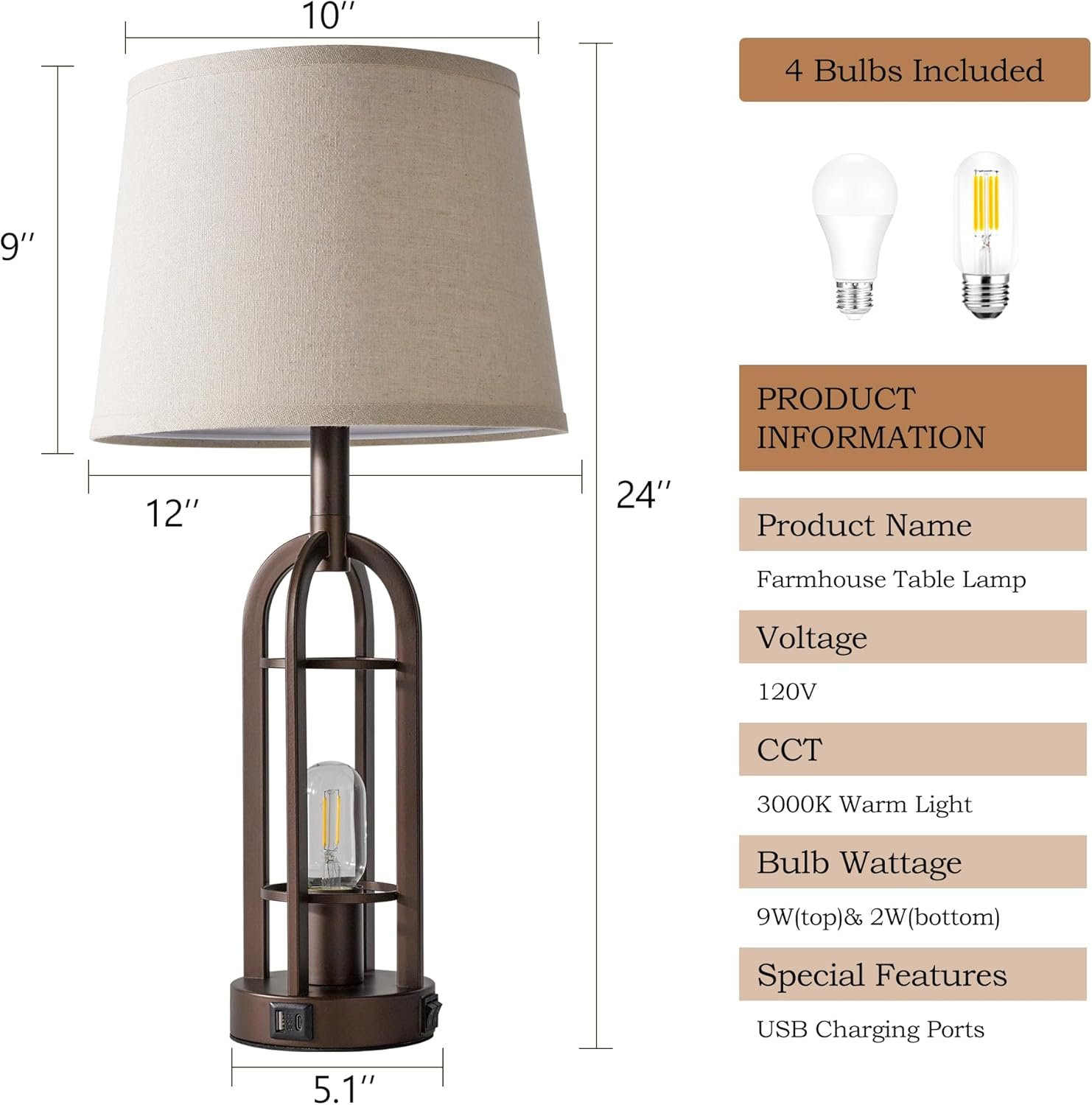 Energy-efficient Lighting: Includes 4 LED Edison bulbs, saving up to 90% on energy costs; the E26 bulbs provide a warm 3000K glow with 805 lumens of brightness; delivering stable cozy light without flicker or dazzle, ideal for farmhouse lamps