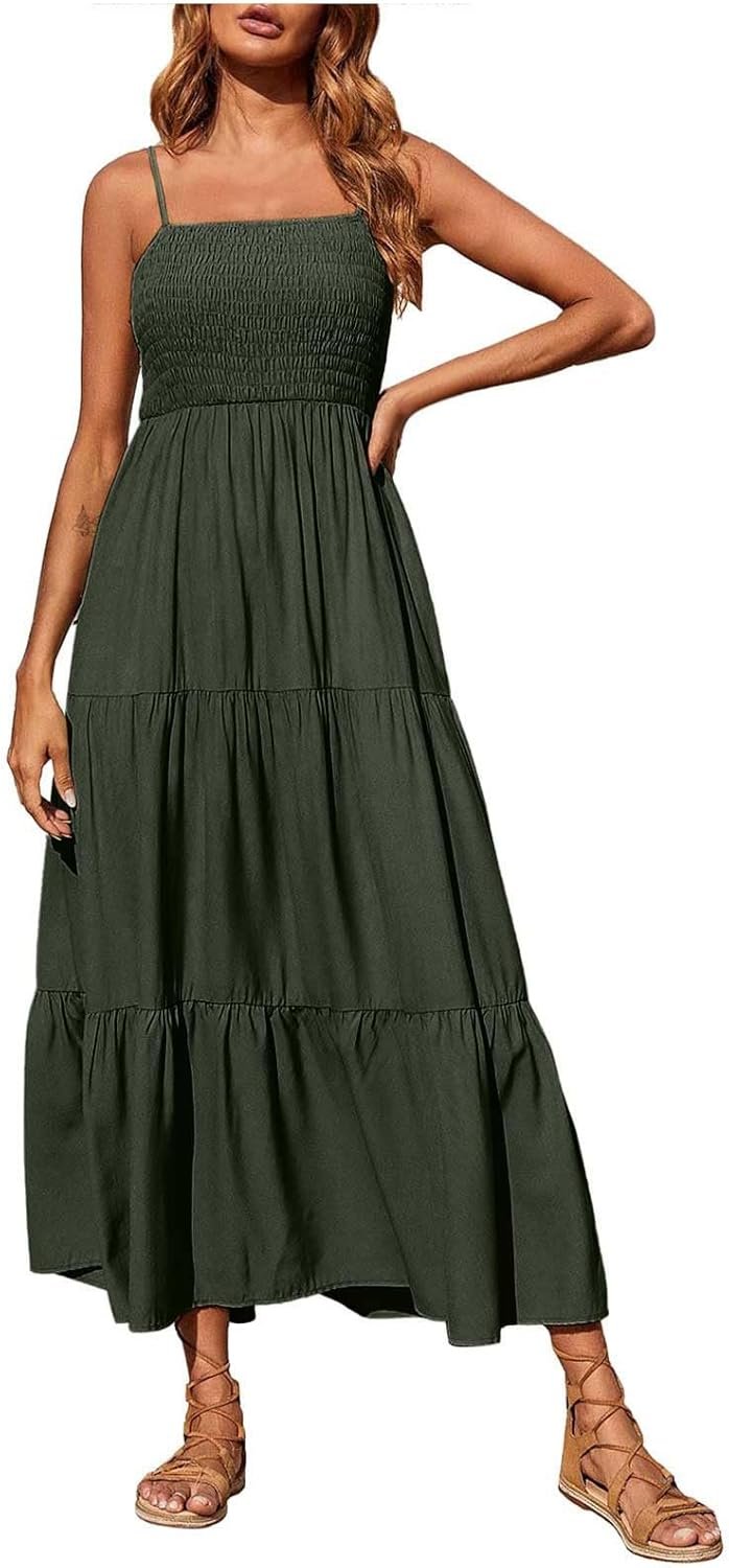 Summer Dresses for Women 2024 Casual Spaghetti Strap Sleeveless Smocked Tiered Swing Boho Maxi Dress Sexy Beach Dress