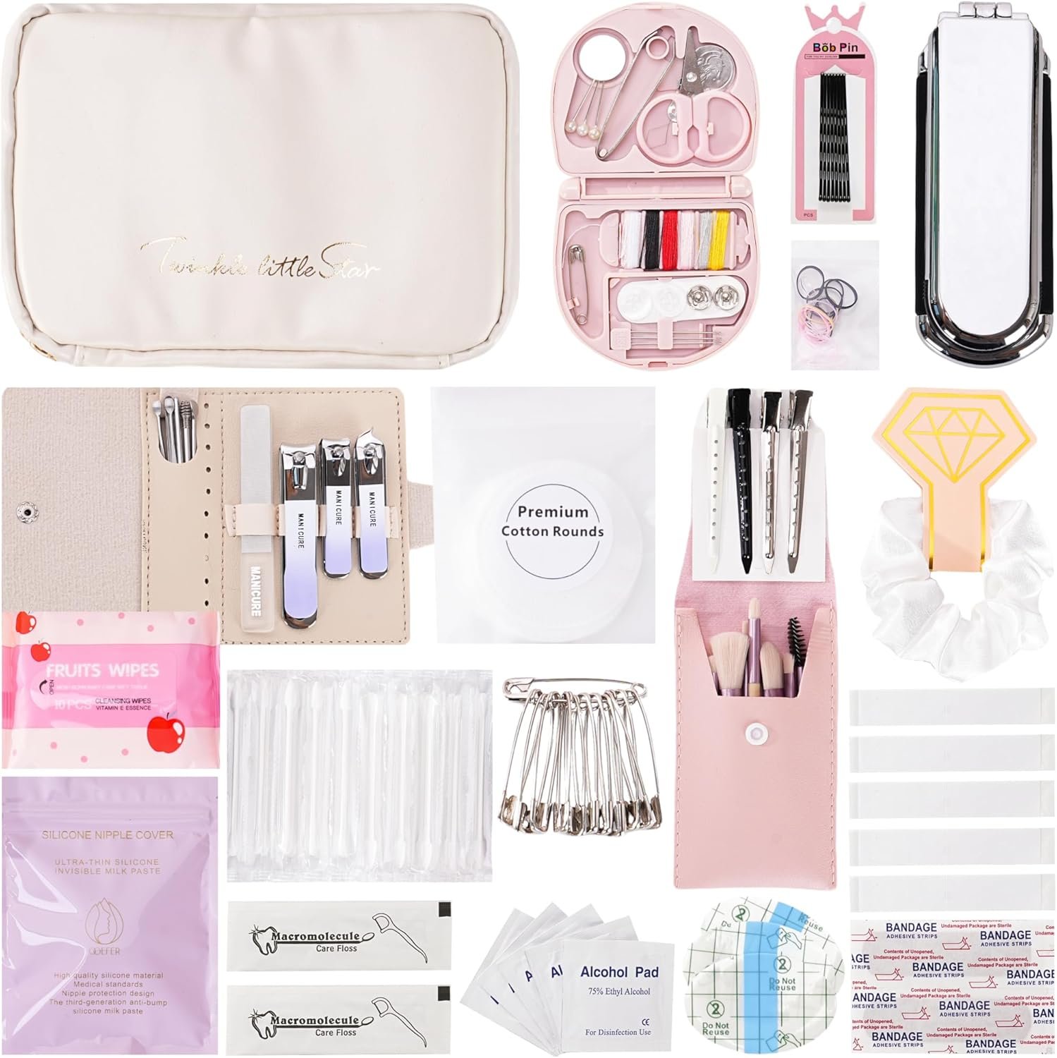 Manicure Set and Personal Care Items: The manicure set includes manicure tools, scissors fingernail clippers, nail files, toenail clippers, all arranged in a faux leather pouch. You will also have a package of wet wipes, silicone nipple covers, 6 strips of douple sided invisible tape, bandages, 4 dental floss, 10 Q-tips, 6 cleaning pads, and a pair of blister pads
